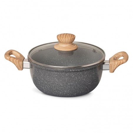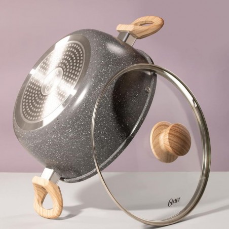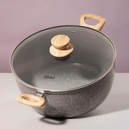 La Olla Oster Marble Edition de 4,5 litros ofrece una combinación de diseño elegante y funcionalidad. Fabricada en aluminio forjado con doble revestimiento de cerámica antiadherente, garantiza una cocción uniforme y saludable. Sus asas revestidas en silicona con diseño de madera proporcionan un agarre seguro y cómodo